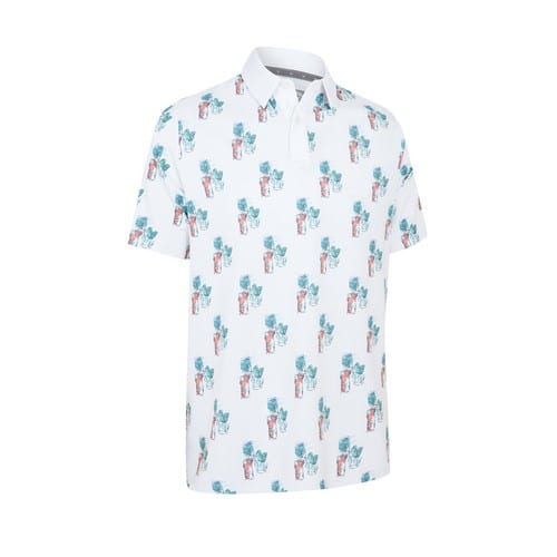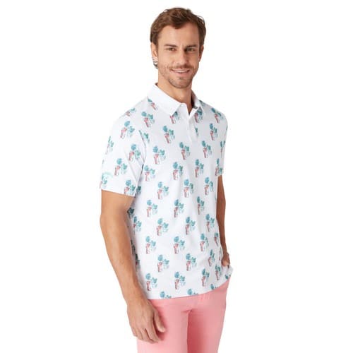 Make a statement on the course with this Callaway golf polo that features a golf cocktail-inspired print for an elevated look. Designed for performance as well, this men’s golf shirt wicks away moisture and includes Swing Techâ„¢ technology for unrestricted swings.
