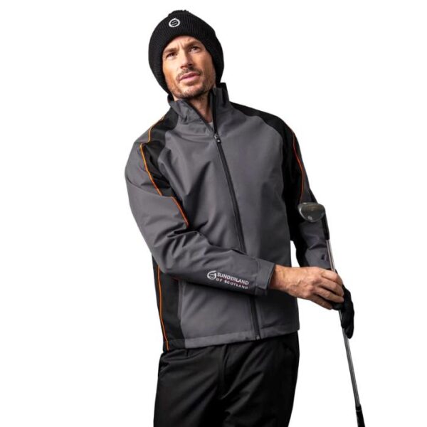 Mens Sunderland Golf Typhoon Waterproof Jacket. Constructed using a lightweight, laminated waterproof fabric with added mechanical stretch. Waterproof zippers, high neck and anti-snag velcro bonded cuffs with inner storm cuffs, enhance the fit of this garment whilst ensuring maximum waterproof protection.